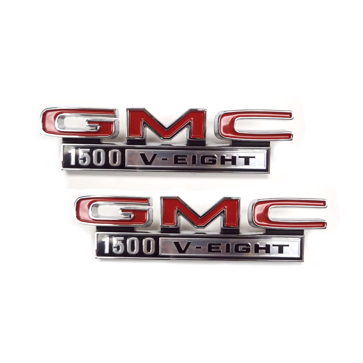 1968-72 GMC Truck “GMC 1500 V-EIGHT” Fender Side Emblems, GM Restoration Part (Replaces GM# 646067) Pair. (68-16721-G158)