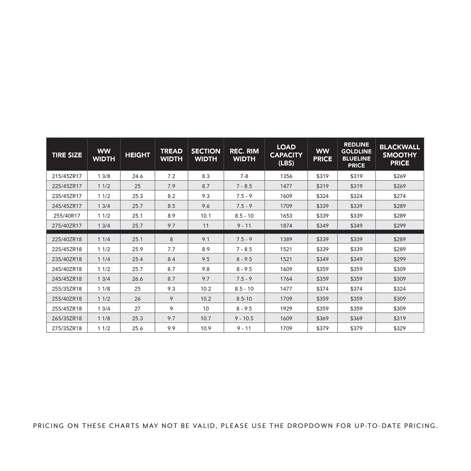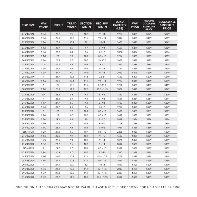 225/40R18, 225/45R18, 235/40R18, 245/40R18, 245/45R18, 255/35R18, 255/40R18, 265/35R18, 275/35R18, 285/35R18, 295/30R18